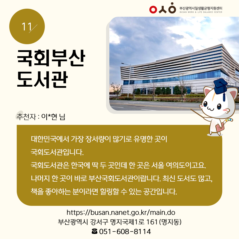 대한민국에서 가장 장서량이 많기로 유명한 곳이 국회도서관입니다. 국회도서관은 한국에 딱 두 곳인데 한 곳은 서울 여의도이고요. 나머지 한 곳이 바로 부산국회도서관이랍니다. 최신 도서도 많고, 책을 좋아하는 분이라면 힐링할 수 있는 공간이기도 해요. 자유롭게 책을 열람하고 대출을 할 수 있고요.