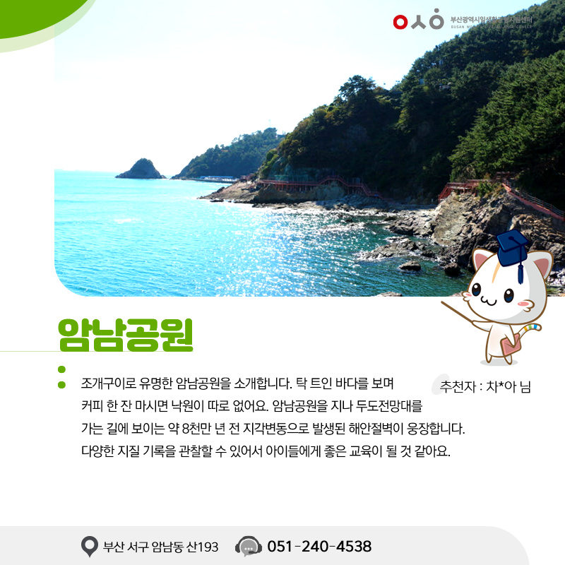 부산의 대표적인 힐링 스팟인 암남공원, 두도전망대, 송도해수욕장, 남항체육공원을 소개합니다.