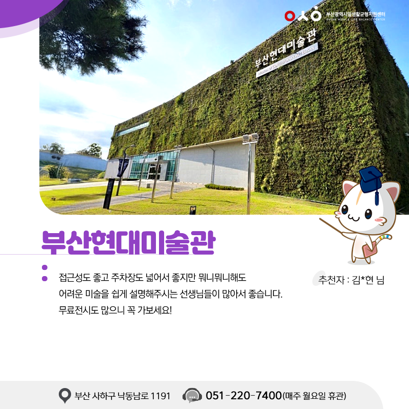 1. 부산현대미술관 - 접근성도 좋고 주차장도 넓어서 좋지만 뭐니뭐니해도 어려운 미술을 쉽게 설명해주시는 선생님들이 많아서 좋습니다. 무료전시도 많고 지금 백남준 선생님 전시회도 하니 정말 엄청난 기회니 꼭 가보세요