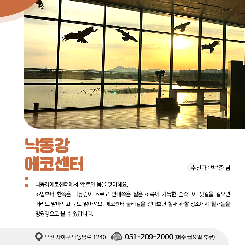 메인으로 이동 함께하는 일생활균형 센터소개 가족친화인증 워라밸 우수기업 함께하는 일생활균형 센터소식 자료실 회원서비스 마이페이지 여가자원 발굴 시민과 함께하는 온라인 이벤트 후기이벤트 여가자원 발굴 워라밸주간행사 여성 근로자 고충상담 지원연계 정부지원제도 일생활균형 온라인 상담 여가자원 여가자원 공유오피스 함께하는 일생활균형 함께하는 일생활균형 시민과 함께하는 온라인 이벤트 후기이벤트 여가자원 발굴 여가자원 공유오피스 워라밸주간행사 2025년 2024년 2023년 2022년 2021년 2020년 여성 근로자 고충상담 지원연계 정부지원제도 일생활균형 온라인 상담 이용안내 온라인 상담 여가자원 페이스북 트위터 카카오스토리 즐겨찾기 인쇄 낙동강 에코센터 관리자 2025-05-08 383 낙동강에코센터에서 확 트인 봄을 맞이 해요초입부터 한쪽은 낙동강물이 흐르고 반대쪽은 짙은 초록이 가득한 숲속. 이 샛길을 걸으면 머리도 맑아지고 눈도 맑아져요. 에코센터 둘렛길을 걷다보면 철새관찰장소에서 철새들을 망원경으로 볼수 있답니다.주말에 낙동강에코센테에서 힐링을 해 보세요 목록