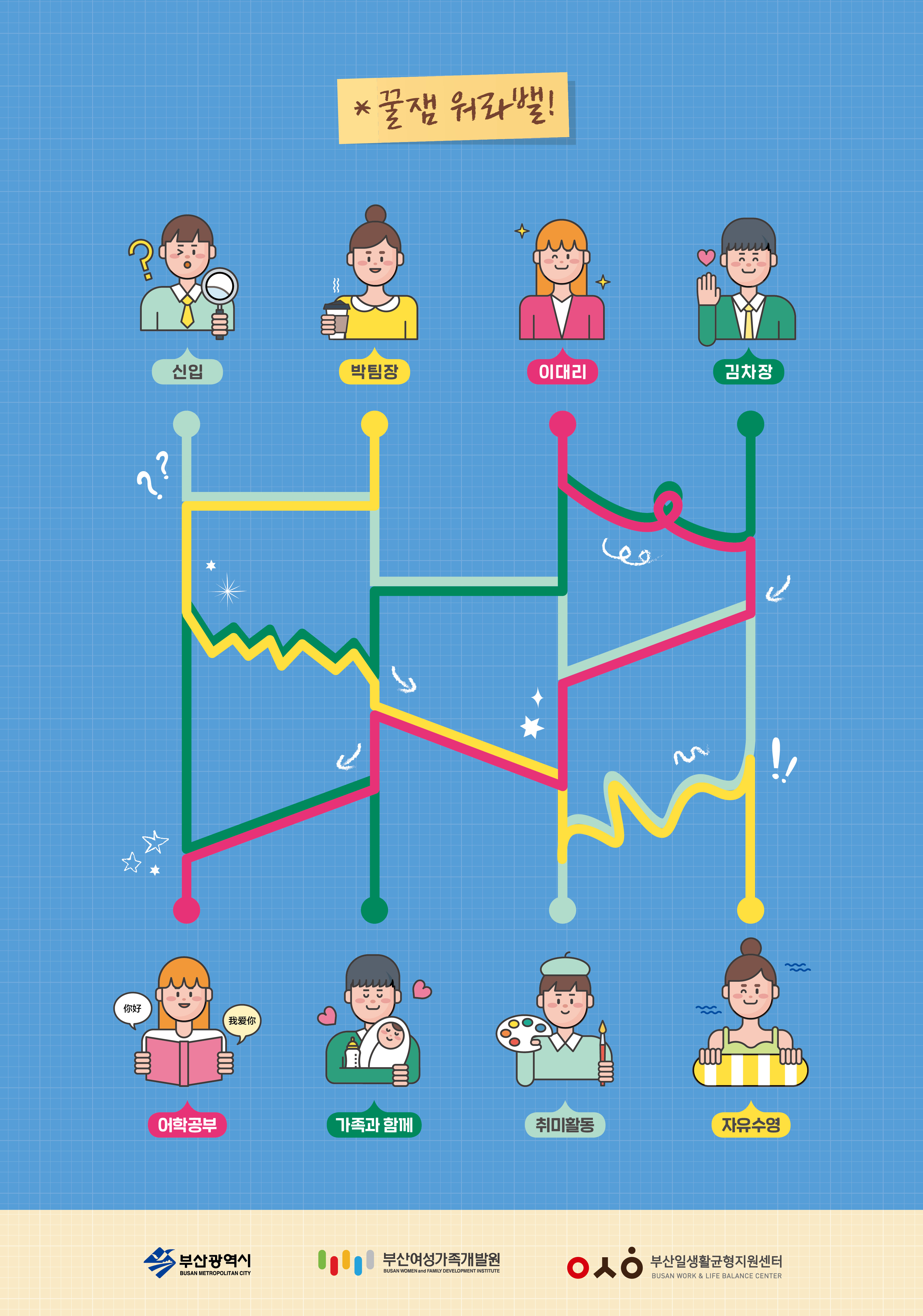 부산일생활균형지원센터에서 제작한 워라밸 홍보 포스터입니다. 꿀잼 워라밸!
