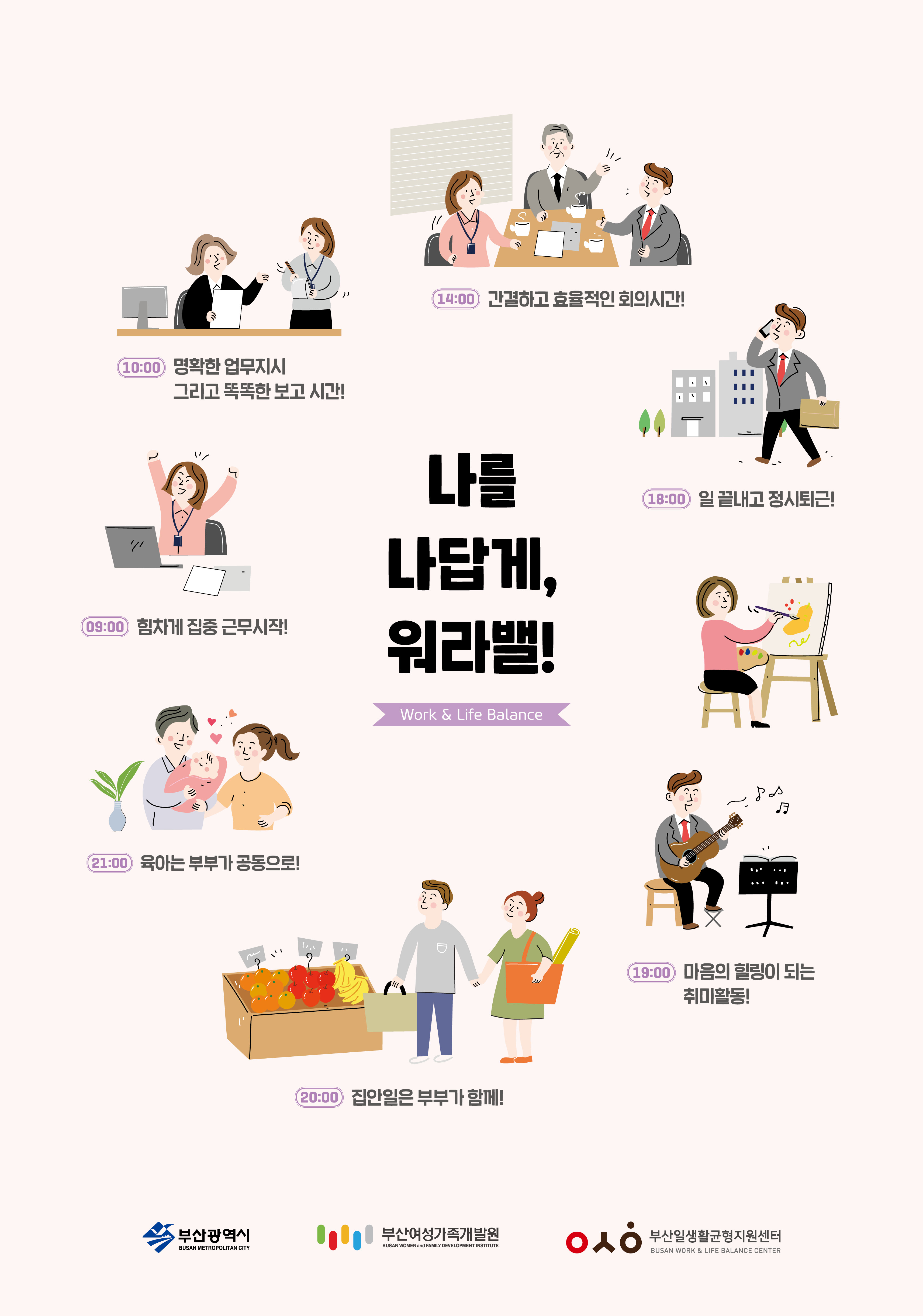 부산일생활균형지원센터에서 제작한 워라밸 홍보 포스터입니다. '나를 나답게'