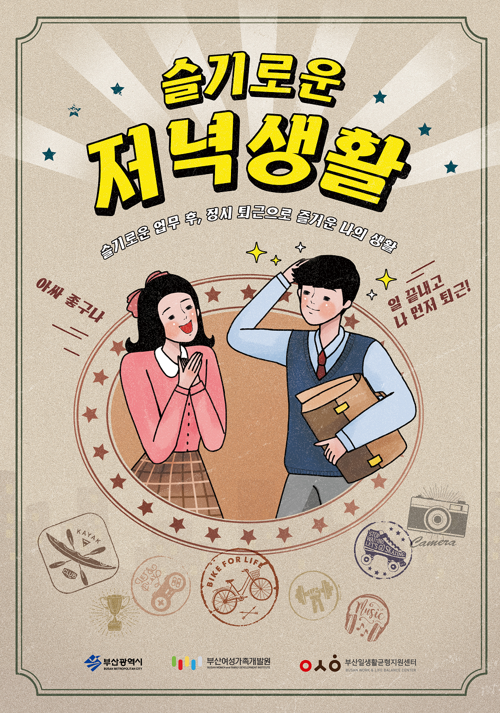 부산일생활균형지원센터에서 제작한 워라밸 홍보 포스터입니다. "슬기로운 저녁생활"