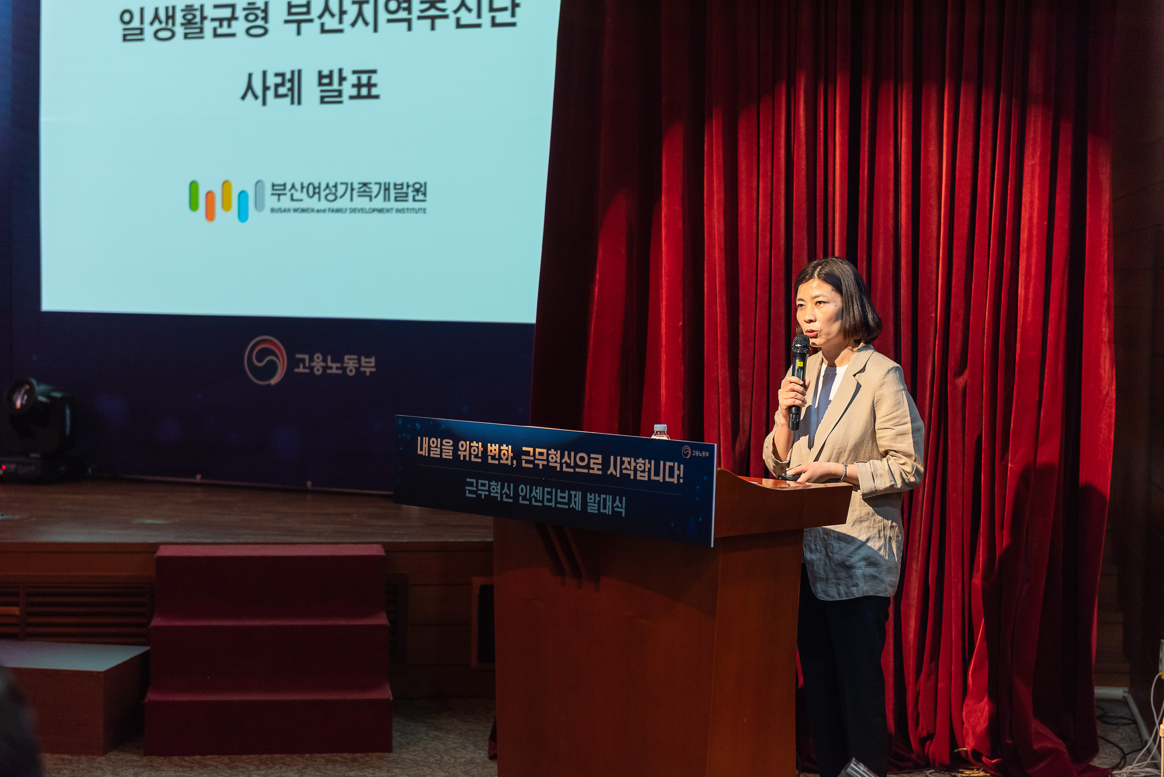 부산여성가족개발원이 3년째 고용노동부로부터 지원받아 운영하고 있는 「일생활균형부산지역추진단」은 5월 22일(수) 이재갑 고용노동부 장관이 참석한「근무혁신 인센티브제 발대식」에서 우수지역으로 사례발표를 하였습니다.