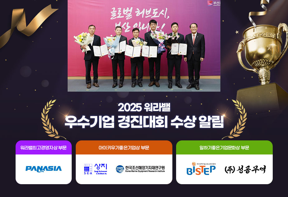 메인으로 이동 워라밸 우수기업 센터소개 가족친화인증 워라밸 우수기업 함께하는 일생활균형 센터소식 자료실 회원서비스 마이페이지 워라밸 우수기업 워라밸 우수기업 2025년 2025년 2024년 2023년 2022년 2021년 2020년 2019년 워라밸 우수기업 워라밸 우수기업 워라밸 우수기업 2025년 ㈜파나시아 ㈜상지엔지니어링건축사사무소 한국조선해양기자재연구원 부산과학기술고등교육진흥원 주식회사 성공무역 2024년 한국선급 오리엔탈정공 유피체인 주식회사 영롱 부산컨테이너터미널 한미유압기계 2023년 ㈜휴넥트 ㈜유영산업 (재)부산문화회관 국제식물검역인증원 말랑하니 주식회사 삼원액트 주식회사 2022년 ㈜동화엔텍 한국자산관리공사 ㈜싸이트플래닝건축사사무소 미트리(주) 경성산업 주식회사 벡스코 2021년 ㈜상지엔지니어링건축사사무소 윌로펌프(주) 재단법인 부산광역시 부산국제교류재단 ㈜한진중공업 ㈜아이오티플렉스 2020년 ㈜부산롯데호텔 주식회사 DRB동일 (재)부산인재평생교육진흥원 ㈜아미글로벌 2019년 부산은행 삼원액트 이샘병원 ㈜유시스 한선엔지니어링 2025년 페이스북 트위터 카카오스토리 즐겨찾기 인쇄 2025년 워라밸 우수기업 2025년 워라밸 우수기업 정보 부문 시상명 업체명 홈페이지 워라밸 최고경영자 부문 부산광역시장상 ㈜파나시아 아이 키우기 좋은 기업 부문 부산광역시장상 ㈜상지엔지니어링건축사사무소 부산광역시장상 한국조선해양기자재연구원 일하기 좋은 기업문화 부문 부산광역시장상 부산과학기술고등교육진흥원 부산광역시장상 주식회사 성공무역