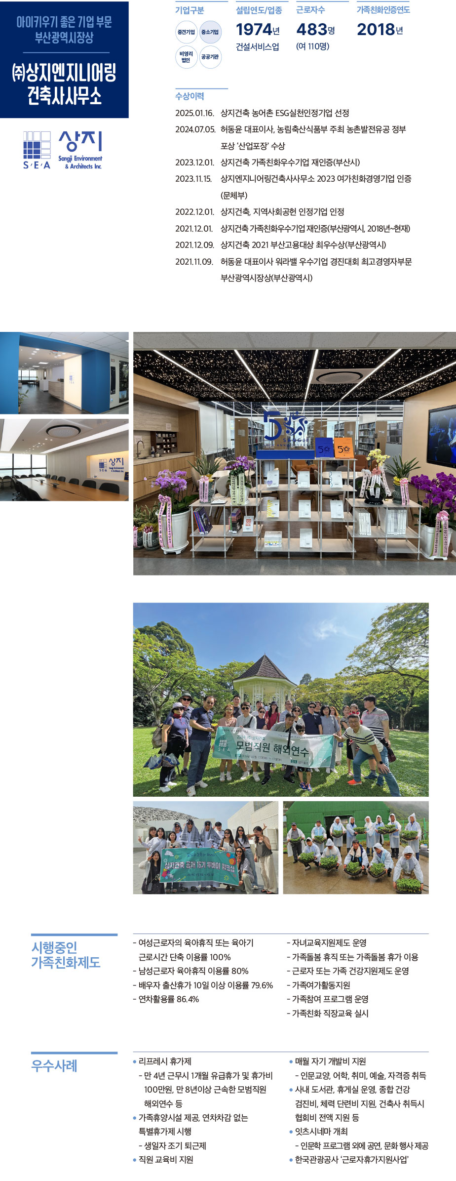 메인으로 이동 워라밸 우수기업 센터소개 가족친화인증 워라밸 우수기업 함께하는 일생활균형 센터소식 자료실 회원서비스 마이페이지 워라밸 우수기업 워라밸 우수기업 2025년 2025년 2024년 2023년 2022년 2021년 2020년 2019년 ㈜상지엔지니어링건축사사무소 ㈜파나시아 ㈜상지엔지니어링건축사사무소 한국조선해양기자재연구원 부산과학기술고등교육진흥원 주식회사 성공무역 워라밸 우수기업 워라밸 우수기업 워라밸 우수기업 2025년 ㈜파나시아 ㈜상지엔지니어링건축사사무소 한국조선해양기자재연구원 부산과학기술고등교육진흥원 주식회사 성공무역 2024년 한국선급 오리엔탈정공 유피체인 주식회사 영롱 부산컨테이너터미널 한미유압기계 2023년 ㈜휴넥트 ㈜유영산업 (재)부산문화회관 국제식물검역인증원 말랑하니 주식회사 삼원액트 주식회사 2022년 ㈜동화엔텍 한국자산관리공사 ㈜싸이트플래닝건축사사무소 미트리(주) 경성산업 주식회사 벡스코 2021년 ㈜상지엔지니어링건축사사무소 윌로펌프(주) 재단법인 부산광역시 부산국제교류재단 ㈜한진중공업 ㈜아이오티플렉스 2020년 ㈜부산롯데호텔 주식회사 DRB동일 (재)부산인재평생교육진흥원 ㈜아미글로벌 2019년 부산은행 삼원액트 이샘병원 ㈜유시스 한선엔지니어링 ㈜상지엔지니어링건축사사무소 페이스북 트위터 카카오스토리 즐겨찾기 인쇄